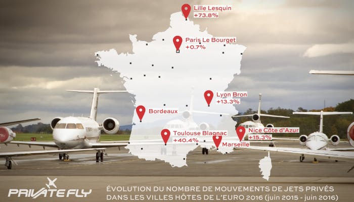 Ainsi, Lille Lesquin, l’aéroport le plus proche de Lens et Villeneuve d’Ascq qui ont accueillis 10 matchs du championnat, a comptabilisé une augmentation de 73,8% de mouvements de jet privé par rapport à juin 2015.