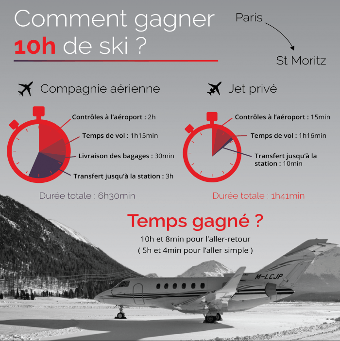 Pour vous convaincre, nous avons comparé les temps de trajet de deux week-ends de ski organisés dans deux des plus prestigieuses stations de ski d’Europe : Verbier et St Moritz, au départ de Paris, en avion de ligne et en jet privé.