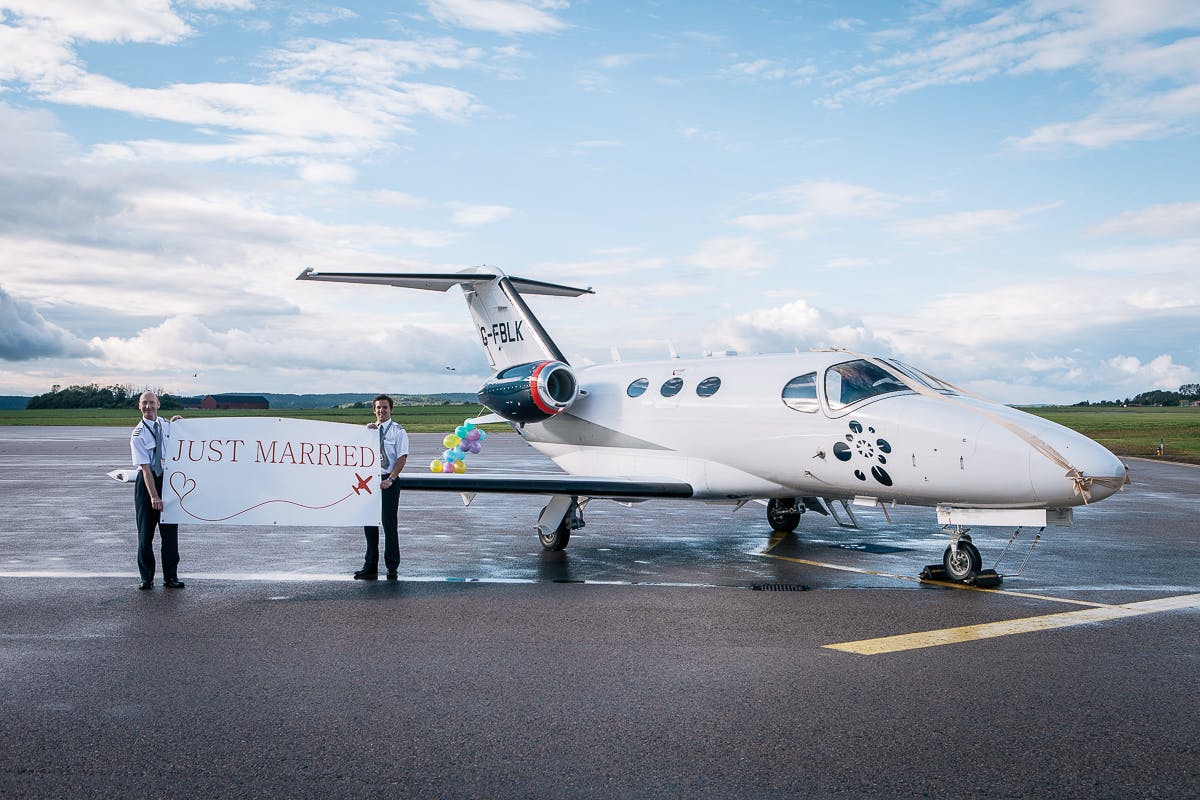 Nous avons organisé un vol très spécial pour un couple tout juste marrié à Stockholm. Le jet était décoré de rubans et ballons et les pilotes tenaint uen pancarte “Just Married”.