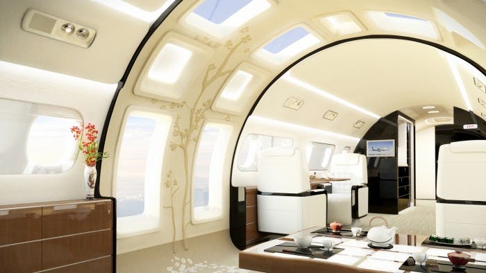 Gulfstream a déjà équipé ses jets d’affaires de larges hublots ovales. Quant à Dassault, il est le premier constructeur à avoir mis en pratique le concept du hublot zénithal en plaçant une fenêtre au plafond de l’entrée du Falcon 5X.