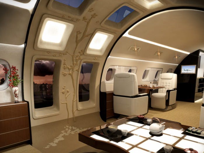 En plus d’intégrer une douche pour deux personnes dans le jet, ils ont décidé de placer au milieu de l’avion une série de larges hublots qui montent jusqu’au plafond.
