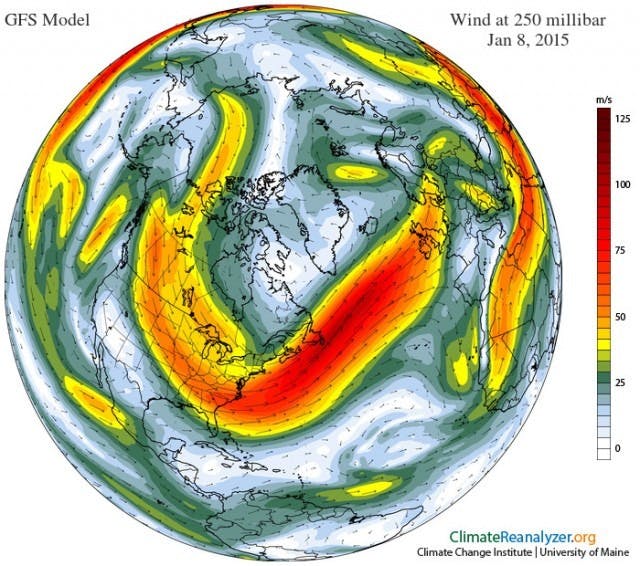 Ces différences de durée de vol sont parfois significatives, comme on l’observe pour des vols transatlantiques qui subissent l’influence des jet-streams : des courants d’air rapides, circulant d’est en ouest et formant des rubans étroits, généralement situés entre 7 et 16 km au-dessus du niveau de la mer, soit l’altitude à laquelle volent la plupart des avions.