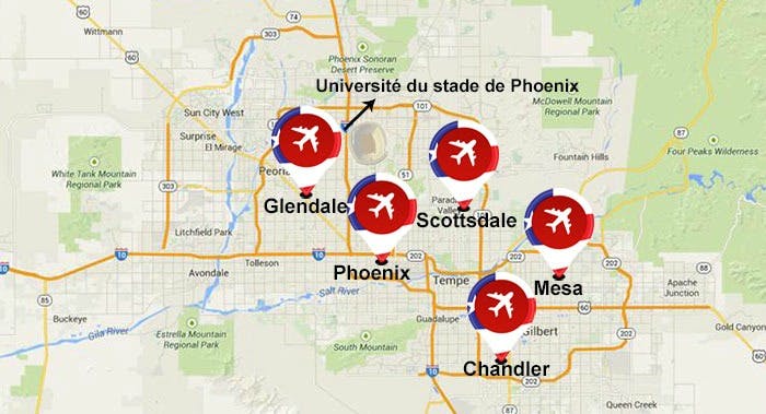 Dans la région, seuls deux aéroports (Sky Harbor et Mesa-Phoenix Gateway) accueillent des vols réguliers. Les autres sont uniquement accessibles en avion privé. Voici la liste des ces installations et une présentation de la façon dont chacune se prépare pour le Super Bowl :
