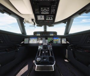 L’innovation est aussi présente dans le cockpit. Le nouveau poste de pilotage à écrans tactiles Symmetry compte plusieurs nouveautés, notamment des mini-manches de contrôle actif (active control sidesticks ou ACS), une technologie développée par la société Honeywell qui permet au pilote et au copilote de voir et de ressentir les actions de l’autre pour améliorer leur coordination et donc leur confort et la sécurité du vol.