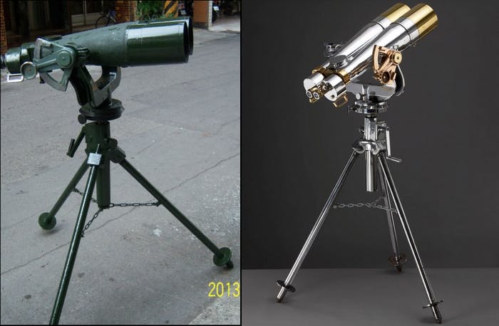 « Nous cherchons des pièces dans le monde entier. Celle-ci date de la Deuxième Guerre mondiale et a été achetée à un habitant de Taïwan appelé Johnny. Nous avons retiré toute la peinture verte d’origine pour obtenir ces magnifiques jumelles, qui grossissent 35 fois et sont aussi pratiques qu’élégantes. »