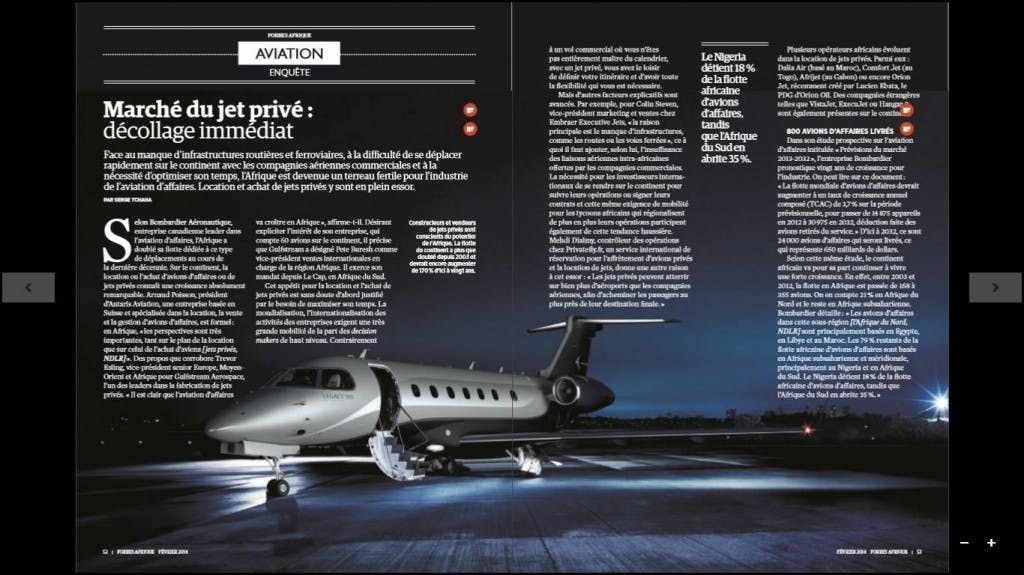 En novembre 2013, j’ai été contacté par le chroniqueur économique Serge Tchaha du magazine Forbes Afrique dans le cadre d’une enquête portant sur le boom des jets privés en Afrique.