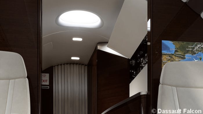 Le Falcon 5X de Dassault est actuellement le jet privé qui a la cabine la plus haute, avec ses 1,98 mètres de haut. Mais ce qui rend l’intérieur du 5X vraiment unique est son hublot zénithal, placé sur le plafond de l’avion, qui éclaire la cabine d’une lumière naturelle.