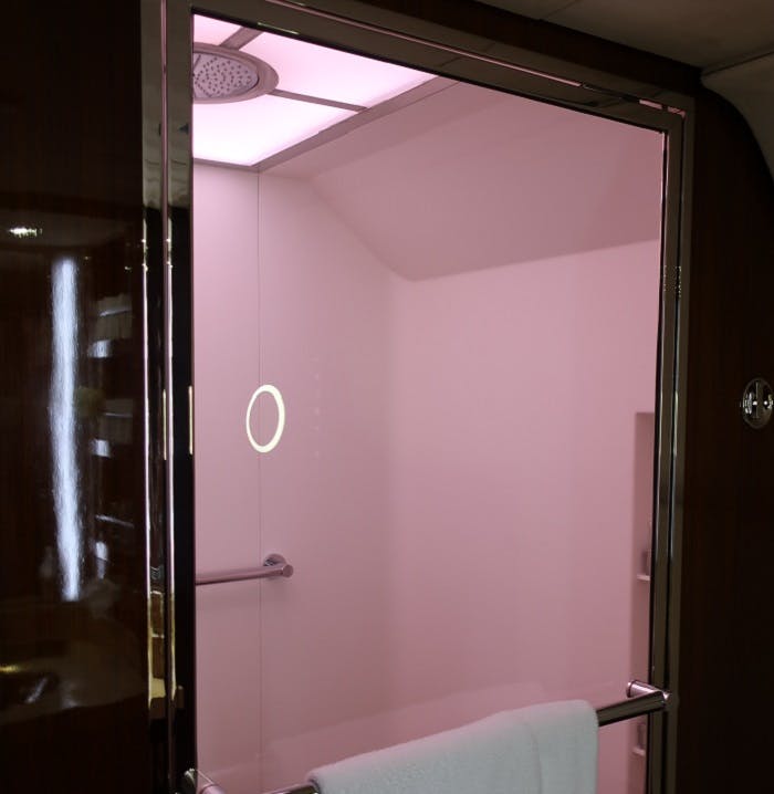 Sur les modèles les plus haut de gamme de cette catégorie, comme les Global de Bombardier, le Falcon 8X de Dassault et les G650 et G650ER de Gulfstream qui peuvent voler plus de 12 heures sans escale, l’espace toilette est encore plus impressionnant.