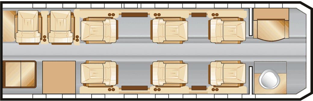 Très populaire dans cette catégorie, le Citation XLS+ est doté de toilettes à l’arrière. L’équipement est le même que dans les toilettes des jets légers (w.c., lave-mains, miroir et rangements), mais une fois à l’intérieur il est plus facile de se mouvoir, ce qui permet d’utiliser l’espace pour se changer.