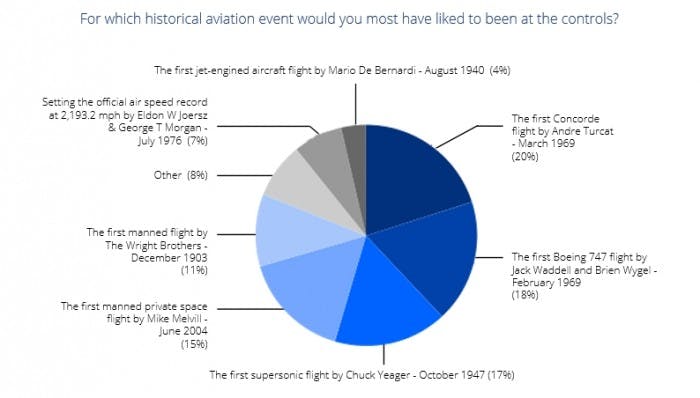 Si les pilotes pouvaient retourner dans le temps, ils aimeraient avant tout prendre le contrôle du premier vol du Concorde en 1969, alors piloté par André Turcat. Cependant, les pilotes de jet privé auraient préféré quant à eux piloter le premier vol du Boeing 747 qui a eu lieu la même année.