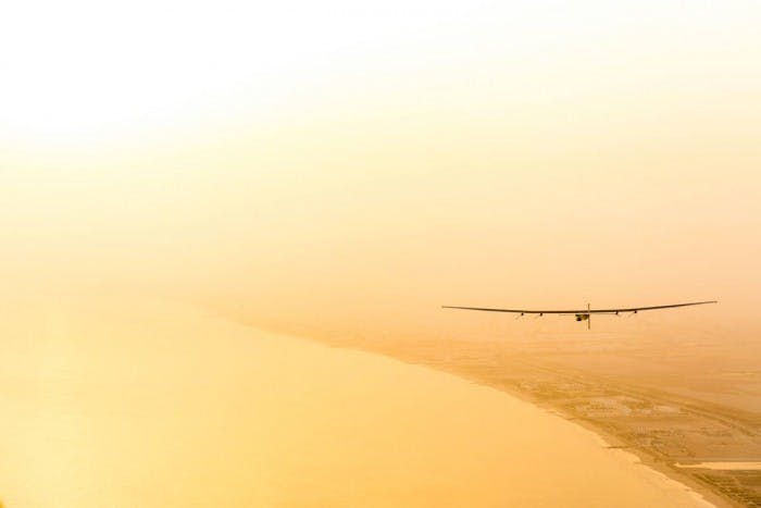 Solar Impulse 2 prend son envol le 9 mars 2015 au départ d’Abou Dhabi sous les commandes d’André Borschberg qui prévoit d’effectuer le tour du monde en cinq mois, dont 25 heures de vol effectif.