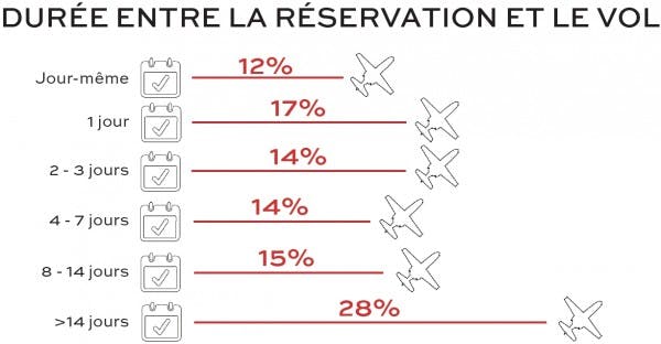 Notre rapport révèle que 29% des vols ont décollé dans les 24 heures suivant la réservation, dont 12% le jour-même. Seulement 28% de nos clients réservent plus de deux semaines à l’avance.