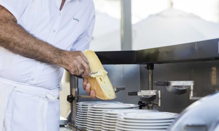 Le Château est une vraie institution pour la raclette. Vous commencerez avec une assiette valaisanne composée de viande séchée, lard, jambon cru et saucisse pour la mise en bouche, avant de déguster une raclette avec 5 différents fromages de laiterie et d’alpage AOP du Valais à discrétion, servie avec pommes de terre en robe des champs, cornichons et petits oignons.